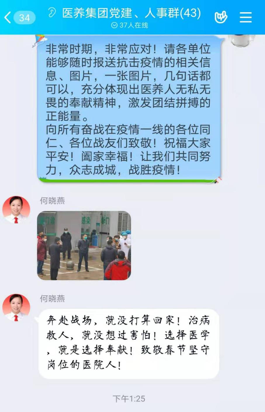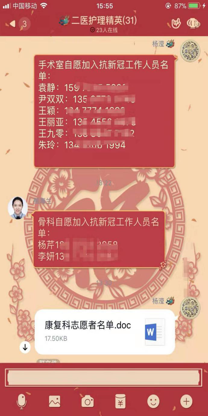 醫(yī)養(yǎng)集團工作群里黨員干部職工報名志愿者接龍,