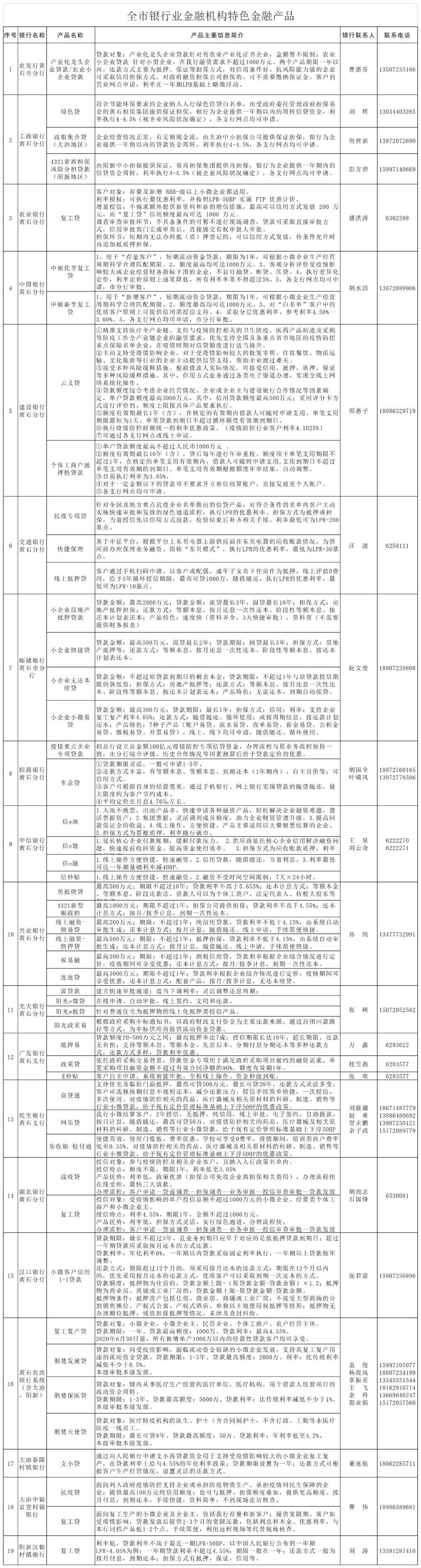 (一)專項(xiàng)再貸款支持重點(diǎn)防疫企業(yè)。專項(xiàng)再貸款是指人民銀行為支持打贏新冠肺炎疫情防控阻擊戰(zhàn),向金融機(jī)構(gòu)提供的低成本再貸款資金。用于支持金融機(jī)構(gòu)向相關(guān)直接參與防疫的重點(diǎn)醫(yī)用物品和生活物資的生產(chǎn)、運(yùn)輸和銷售的重點(diǎn)企業(yè)提供優(yōu)惠利率信貸資金。總規(guī)模為3000億元,其中,全國性銀行2000億元,重點(diǎn)省份的地方法人機(jī)構(gòu)1000億元(湖北200億元)。1、支持范圍:資金投向?qū)嵭兄攸c(diǎn)企業(yè)名單制動態(tài)管理。包括全國性重點(diǎn)企業(yè)名單和省重點(diǎn)企業(yè)名單。黃石市目前納入目錄內(nèi)防疫重點(diǎn)企業(yè)合計(jì)67家,其中全國性重點(diǎn)企業(yè)8家(其中8家既是國家級又是省級重點(diǎn)),省級重點(diǎn)企業(yè)67家。2、承辦機(jī)構(gòu):農(nóng)發(fā)行只能向全國性重點(diǎn)企業(yè)發(fā)放;湖北銀行、漢口銀行只能對省級重點(diǎn)企業(yè)發(fā)放;工、農(nóng)、中、建、交、郵儲行既可以對國家級重點(diǎn)企業(yè)發(fā)放優(yōu)惠貸款,也可以對省級重點(diǎn)企業(yè)發(fā)放優(yōu)惠貸款。3、政策內(nèi)容:發(fā)放給企業(yè)的貸款利率上限為最近一次公布的一年期貸款市場報(bào)價利率(LPR)減100基點(diǎn),如:2月20日公布的LPR為4.05%,則3月20日前貸款發(fā)放利率上限為3.05%。同時,中央財(cái)政按企業(yè)獲得貸款的實(shí)際利率的50%進(jìn)行貼息,企業(yè)實(shí)際承擔(dān)的利率不會超過1.6%,再貸款期限為1年。4、申報(bào)流程:由符合條件的企業(yè)向金融機(jī)構(gòu)申請。相對于一般貸款,要求較為簡化,均實(shí)行線上審批、審批權(quán)限下放、信用貸款或抵押承諾制。5、部門職責(zé):發(fā)改和經(jīng)信部門負(fù)責(zé)重點(diǎn)企業(yè)名單申報(bào)。人民銀行負(fù)責(zé)向金融機(jī)構(gòu)發(fā)布推送重點(diǎn)企業(yè)名錄,督促金融機(jī)構(gòu)第一時間對接,及時授信、放貸,監(jiān)測合格貸款情況,統(tǒng)計(jì)上報(bào)金融支持進(jìn)展,發(fā)放專項(xiàng)再貸款。財(cái)政部門負(fù)責(zé)貼息。(二)再貸款再貼現(xiàn)專用額度支持企業(yè)復(fù)工復(fù)產(chǎn)。支農(nóng)、支小專用額度是指人民銀行落實(shí)習(xí)近平總書記重要講話精神和國務(wù)院常務(wù)會議要求,統(tǒng)籌推進(jìn)疫情防控和經(jīng)濟(jì)社會發(fā)展,切實(shí)解決企業(yè)復(fù)工復(fù)產(chǎn)迫切問題,加大金融對中小微企業(yè)和春耕備耕的支持力度,而專門用于企業(yè)復(fù)工復(fù)產(chǎn)的在再貸款。全國支農(nóng)再貸款、支小再貸款、再貼現(xiàn)專用額度共計(jì)5000億元,其中支農(nóng)再貸款專用額度1000億元、支小再貸款專用額度3000億元、再貼現(xiàn)專用額度1000億元。1、支持范圍:支農(nóng)再貸款全部用于發(fā)放涉農(nóng)貸款,重點(diǎn)支持脫貧攻堅(jiān)、春耕備耕、禽畜養(yǎng)殖、縣域小微企業(yè)復(fù)工復(fù)產(chǎn)等領(lǐng)域。支小再貸款全部用于發(fā)放普惠小微企業(yè)貸款(單戶授信1000萬元及以下小微企業(yè)貸款,含個體工商戶、小微企業(yè)主經(jīng)營性貸款),重點(diǎn)支持受疫情影響較大的外貿(mào)、制造業(yè)、旅游娛樂、住宿餐飲、交通運(yùn)輸?shù)刃袠I(yè)的小微企業(yè)和個體工商戶。專用再貼現(xiàn)優(yōu)先支持涉農(nóng)票據(jù)、小微企業(yè)票據(jù)和民營企業(yè)票據(jù),重點(diǎn)支持復(fù)工復(fù)產(chǎn)的小微企業(yè)、春耕備耕,以及受疫情影響較為嚴(yán)重的小微企業(yè)。2、承辦機(jī)構(gòu):再貸款支持黃石市農(nóng)村商業(yè)銀行、村鎮(zhèn)銀行共6家地方法人金融機(jī)構(gòu)發(fā)放涉農(nóng)貸款和普惠小微企業(yè)貸款;再貼現(xiàn)支持全部銀行業(yè)金融機(jī)構(gòu)按照行業(yè)要求開展貼現(xiàn)業(yè)務(wù)。3、政策內(nèi)容:涉農(nóng)和普惠小微企業(yè)貸款利率不高于一年期LPR加50個基點(diǎn),如:2月20日公布的LPR為4.05%,則3月20日前貸款發(fā)放利率上限為4.55%。再貸款發(fā)放期限為1年,發(fā)放貸款的有效時間為自“銀發(fā)〔2020〕53號”文印發(fā)之日起至2020年6月30日止。4、申報(bào)流程:符合條件的企業(yè)(個體工商戶)可以就近向轄區(qū)農(nóng)村商業(yè)銀行、村鎮(zhèn)銀行等地方法人金融機(jī)構(gòu)提出貸款申請,銀行在風(fēng)險自擔(dān)的前提下,自主決策發(fā)放貸款。5、發(fā)放模式:再貸款采取“先貸后借”報(bào)賬式發(fā)放模式,銀行先發(fā)放貸款,人民銀行再發(fā)放再貸款1:1置換銀行所發(fā)放的貸款??蛇x擇質(zhì)押方式、信用方式或組合方式發(fā)放。6、申請條件:再貸款申請對象的最近一個季度宏觀審慎評估(MPA)結(jié)果為A類或B類。再貼現(xiàn)發(fā)放對象涉農(nóng)、小微、民營企業(yè)三類貼現(xiàn)票據(jù)合計(jì)占比不低于60%。(三)實(shí)施普惠金融定向降準(zhǔn)。依據(jù)《中國人民銀行關(guān)于實(shí)施普惠金融定向降準(zhǔn)的通知》(銀發(fā)〔2020〕66號)精神,按普惠金融定向降準(zhǔn)考核結(jié)果調(diào)整金融機(jī)構(gòu)存款準(zhǔn)備金率。1、實(shí)施時間:湖北轄內(nèi)定向降準(zhǔn)工作推遲至2020年3月23日(復(fù)工)后實(shí)施,實(