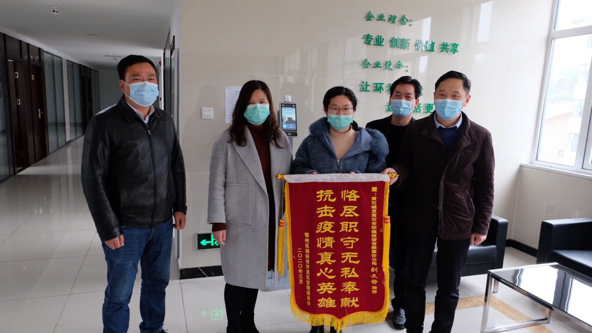 2020年3月31日上午,鄂州花湖經(jīng)濟(jì)開發(fā)區(qū)管理委員會(huì)工作人員專程來(lái)到環(huán)投公司,將寫著“恪盡職守?zé)o私奉獻(xiàn)、抗擊疫情真心英雄”的感謝錦旗送到公司財(cái)務(wù)融資部劉文靜手中,感謝她在疫情期間對(duì)花湖鎮(zhèn)站前社區(qū)疫情防控工作做出的貢獻(xiàn)。