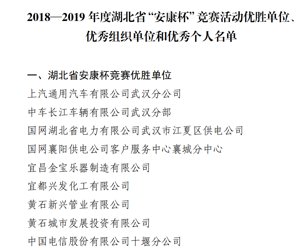 湖北省“安康杯”競賽由湖北省總工會、湖北省應急管理廳聯(lián)合主辦?!鞍部当备傎惪己藰藴室罁?jù)各行業(yè)的安全生產(chǎn)管理特點、傷亡事故和職業(yè)病控制水平等綜合因素制定,通過競賽考核參賽企業(yè)的安全生產(chǎn)管理、領(lǐng)導者安全生產(chǎn)意識、職工安全生產(chǎn)知識水平和能力、安全生產(chǎn)等各項指標。2018—2019年度共評出58個優(yōu)勝單位、30個優(yōu)秀組織單位、40名優(yōu)秀個人。