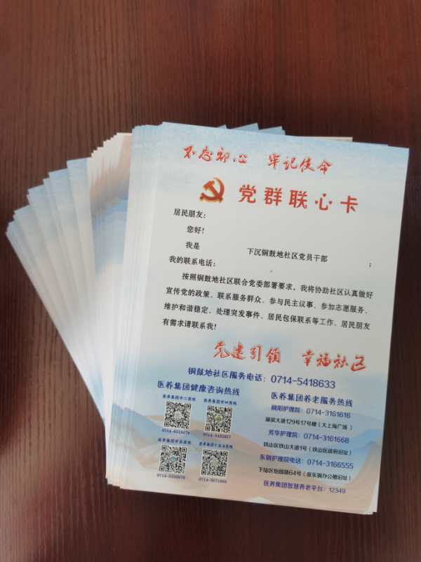 李京鶴表示,此次發(fā)放“黨群聯(lián)心卡”是下沉黨員干部入戶宣傳的一種有效措施。鄂東醫(yī)養(yǎng)集團聯(lián)系社區(qū)工作隊精心制作的“黨群聯(lián)心卡”,靈活解讀下沉社區(qū)工作任務(wù),讓居民更深入了解政策,建立起便捷的溝通橋梁,有利于更好發(fā)揮網(wǎng)格化管理作用,在居民需要幫助的時候能夠及時聯(lián)系到社區(qū)下沉黨員干部。同時,結(jié)合醫(yī)養(yǎng)集團醫(yī)療養(yǎng)老資源優(yōu)勢和社區(qū)老年群體較多的特點,將醫(yī)養(yǎng)集團各直屬醫(yī)院、養(yǎng)老服務(wù)機構(gòu)健康熱線進行了公布,用心用情提升入戶結(jié)對成效。