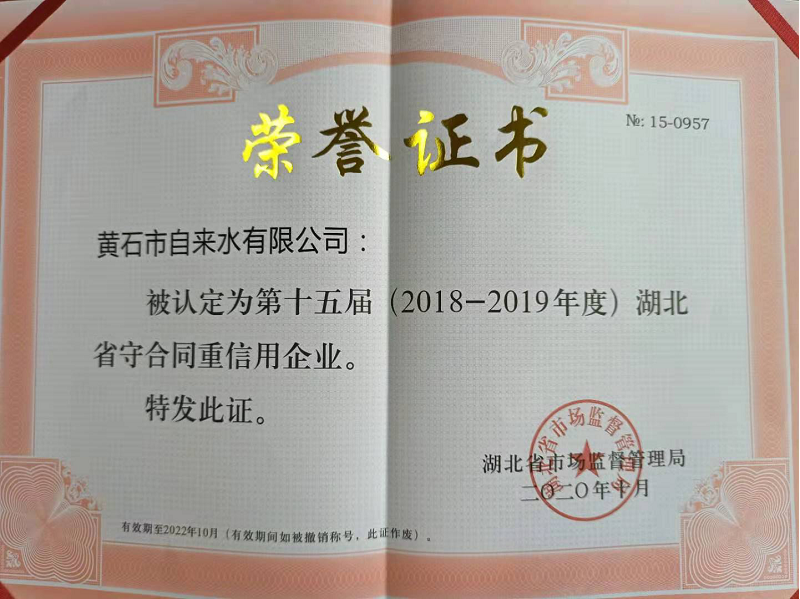 為營造誠實(shí)守信的市場(chǎng)營商環(huán)境,今年,省市場(chǎng)監(jiān)督管理局組織開展了湖北省第十五屆(2018-2019年度)“守合同重信用”企業(yè)評(píng)選活動(dòng)。黃石市自來水有限公司憑借健全的企業(yè)信用管理體系、優(yōu)良的合同履約及信用狀況成功入選。