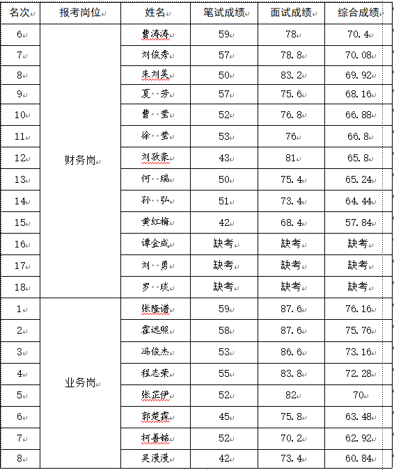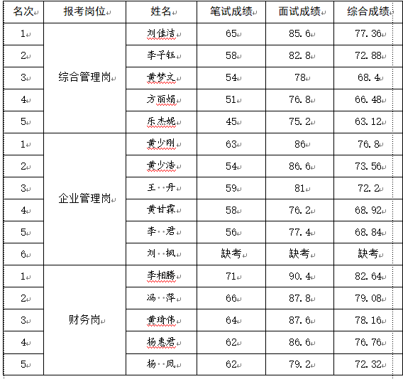 根據(jù)《黃石城發(fā)集團(tuán)總部公開(kāi)遴選工作人員公告》,按筆試成績(jī)占40%、面試成績(jī)占60%的比例計(jì)算綜合成績(jī)?,F(xiàn)將市城發(fā)集團(tuán)總部遴選工作人員筆試、面試及綜合成績(jī)公告如下: